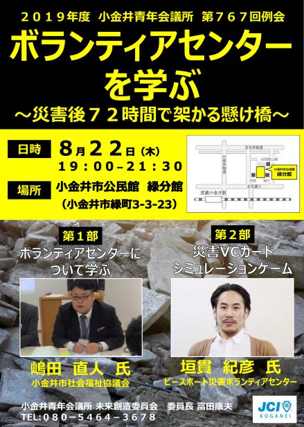 今回は、小金井市社会福祉協議会の嶋田主事にボランティアセンターについてお話頂くととももに、災害VCカードシュミレーションゲームにより災害時の対応を疑似体験します。