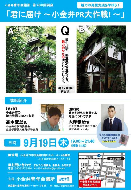 9月19日(木)に開催される第768回例会「君に届け〜小金井PR大作戦〜」のご案内をです。